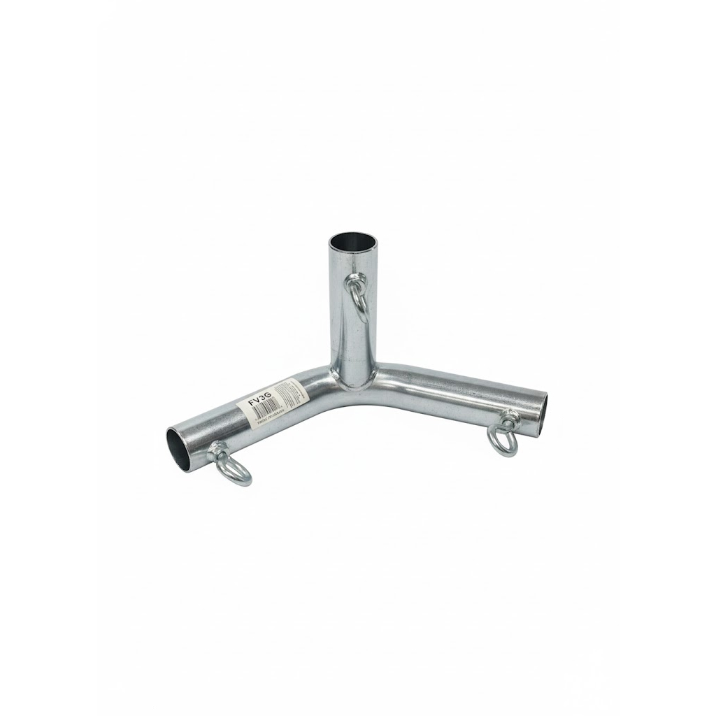 Material: Constructed from heavy-duty, cast or fabricated galvanized steel, engineered for superior tensile strength and resistance to torsional stress. The robust steel construction is necessary to withstand the continuous stress of a fully tensioned tent frame and repeated assembly/disassembly cycles common in rental operations. Design: A 3-Way Fitting (also known as a Corner or “L” Fitting) is designed with three intersecting connection points at a 90-degree angle. Each socket is perfectly sized (1-3/8″ inner diameter) to accept a 1-3/8″ diameter tent pole (leg, rafter, or ridge pole). The sockets include pre-drilled holes for securing the poles with quick-release pins (e.g., clevis pins or locking pins), ensuring a fast, stable, and tool-free connection. Function: This component forms the corners of a rectangular tent frame, connecting two horizontal roof support poles (rafter and ridge pole) to one vertical leg pole. It is critical for establishing the structural shape and integrity of the tent. Finish: Hot-dip galvanized coating is applied to all surfaces to provide maximum protection against rust, chipping, and corrosion, extending the fitting’s usable lifespan in all weather conditions. Compatibility: Specifically used with 1-3/8” diameter perimeter and roof support poles in residential and lighter commercial frame tent systems.